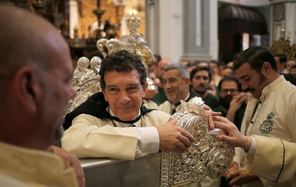 Голливудский актер приехал в испанский город Малага, где народился и начала заниматься актерским мастерством. Там он принял участи в католической мессе в честь Вербного воскресенья. Актер облачился в специальный наряд и шел во главе шествия.
