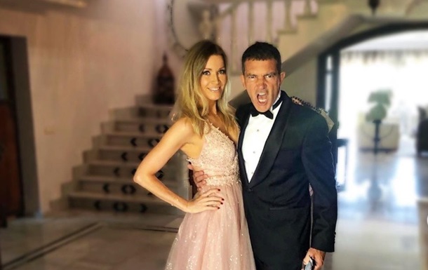 На фотографии Бандерас позирует в черном смокинге, в то время, как его возлюбленная — в эффектном розовом платье с пышным подолом и глубоким декольте.