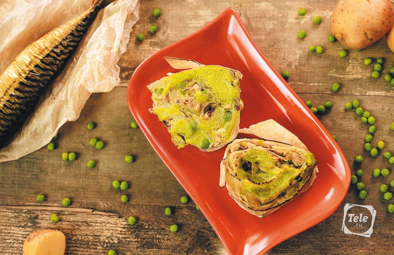 Ингредиенты: лаваш тонкий — 1 шт. Для начинки — скумбрия горячего копчения — 1 шт., картофель — 3 шт., масло оливковое с чесноком — 30 мл, укроп, петрушка — несколько веточек. Для соуса: лук-порей (зеленая часть) — 150 г, молоко — 200 мл, зеленый горошек замороженный — 50 г, соль, перец