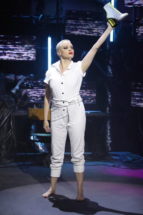 На подиуме актриса появилась в белом комбинезоне с капюшоном и без обуви…да, она прошлась босиком, при этом держа одну туфлю у себя в руке! Ее губы были ярко накрашены в красный цвет, что немало значит в рамках показа. Сам дизайнер за кулисами шоу описал моделей как «символ неповиновения», которые используют обувь «как средство самовыражения». Видимо, Роуз решила отличиться больше остальных.