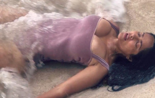 Актриса как-будто позволила волнам себя затягивать в воду и вытаскивать на берег, а в это время ее снимали. На некоторых кадрах звезду полностью покрывают волны.