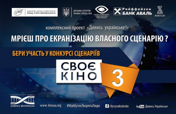 Продолжается ежегодный конкурс сценариев «СВОЕ КИНО-3». Традиционно Проект «Смотри украинское» ищет сценарии короткометражных, мотивирующих фильмов, в которых главным героем является инициативный и ответственный человек, который своими действиями делает изменения, приближает лучшее будущее, вдохновляет других.