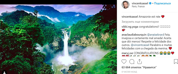 «Амазонка родилась», – рассказал сам Венсан в Instagram, не приведя никаких других подробностей.